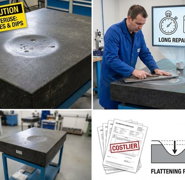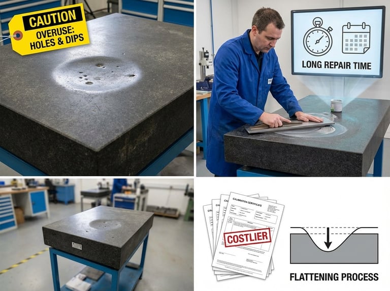 Overuse of a single spot creates holes and dips. Fixing them requires a significantly longer time commitment to lap back into tolerance. Creating this condition in plates leads to costlier calibrations. To flatten a surface plate, the rest of the plate must be lapped down to match the lowest point.